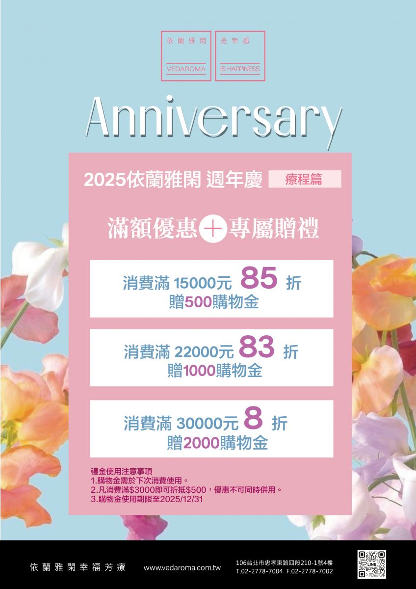 2025依蘭雅閑 週年慶 療程篇|專屬寵愛 滿額優惠 + 專屬贈禮 消費滿 15,000元 → 85 折 贈【500購物金】 消費滿 22,000元 → 83 折 贈【1000購物金】 消費滿 30,000元 → 8 折 贈【2000購物金】 禮金使用注意事項 1.購物金需於下次消費使用。 2.凡消費滿$3000即可折抵$500,優惠不可同時併用。 3.購物金使用期限至2025/12/31 如要購買與了解療程,請至官方LINE@詢問,會由專人為您服務,謝謝您。